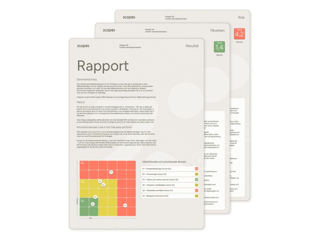 Med Scopes gör du en dubbel väsentlighetsanalys på några timmar – inte veckor. Verktyget guidar dig steg för steg och använder automatiskt data om ditt företag för att spara tid. Analysen följer kraven i CSRD, så att du snabbt får koll på vilka hållbarhetsfrågor som är viktigast att rapportera på.