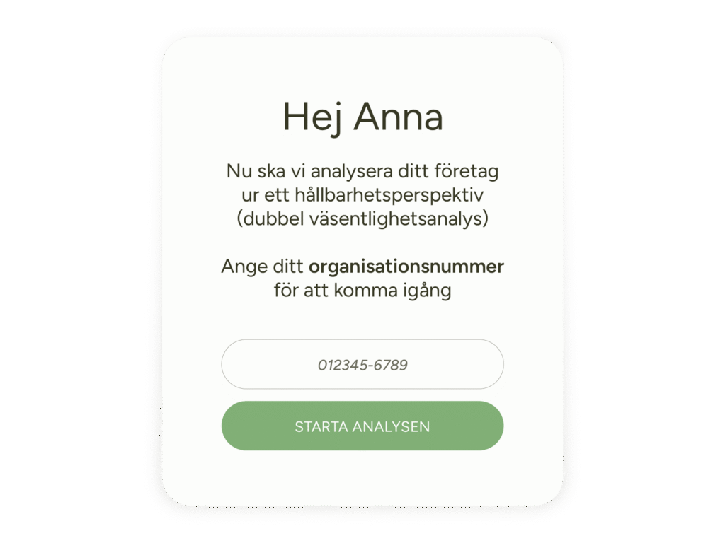 Onboardingen är enkel och tar bara några minuter. Du anger ditt organisationsnummer – sedan hämtar Scopes automatiskt den data som behövs för att komma igång. Därefter guidar vår AI dig steg för steg genom processen, så att du snabbt får en färdig hållbarhetsanalys anpassad för ditt företag.